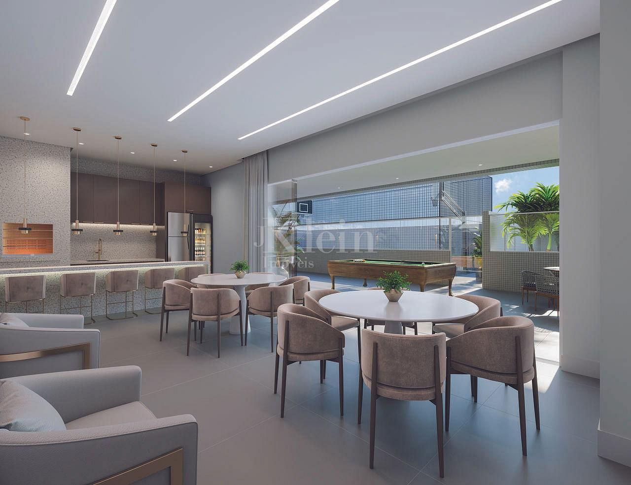 Planta ampla com living integrado e sacada com churrasqueira