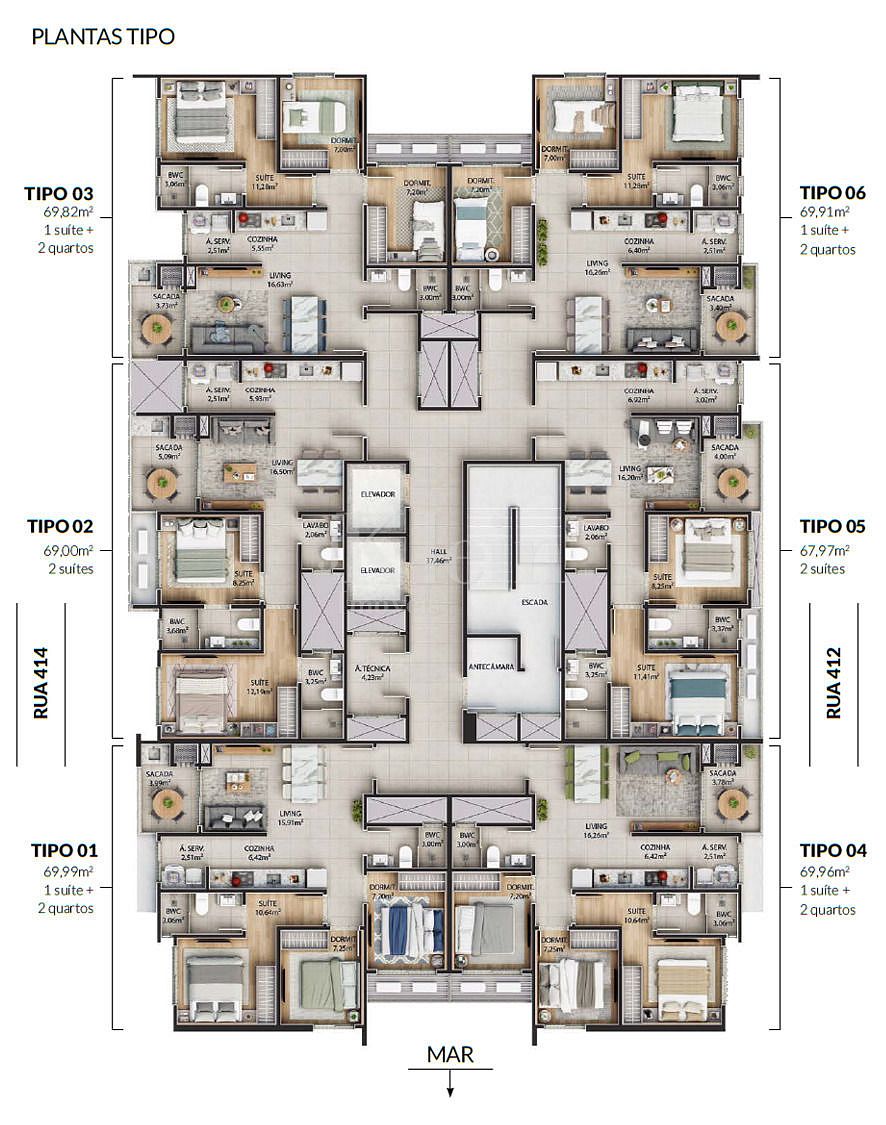 A metragem de 69m² é muito bem aproveitada. Diferente de plantas compactas mal resolvidas, o Aqua Tower oferece: