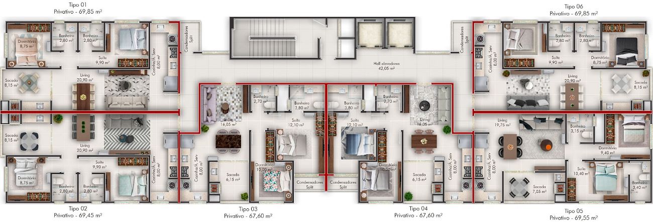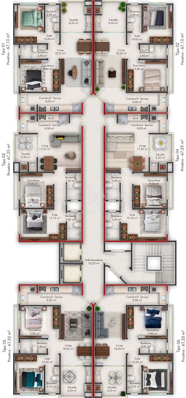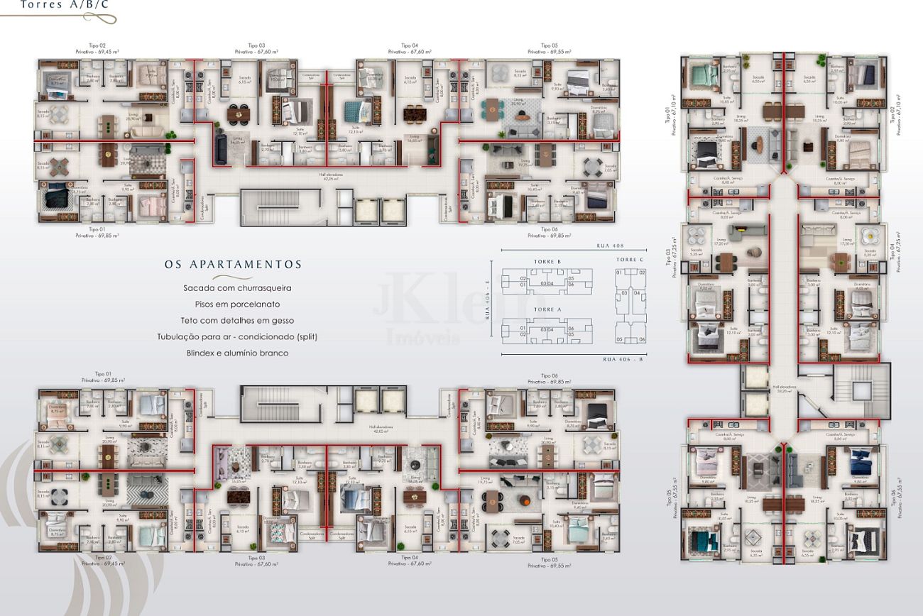 Os apartamentos contam com plantas bem distribuídas, com metragens entre aproximadamente 67 m² e 70 m² privativos, oferecendo living integrado, sacada, cozinha com área de serviço e dormitórios confortáveis, garantindo praticidade e conforto no dia a dia. O projeto prioriza ambientes bem iluminados e funcionais, atendendo ao perfil de famílias, casais e investidores que buscam liquidez e valorização.