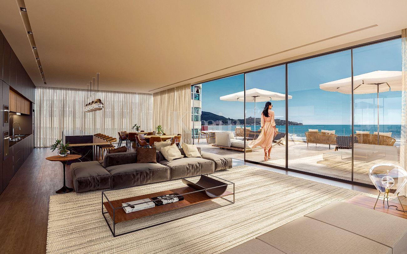 Cada apartamento no Sunny Coast foi projetado para oferecer vista plena do oceano. A fachada ventilada proporciona melhor isolamento térmico e acústico, enquanto as amplas portas-janelas com abertura total integram o living à paisagem.