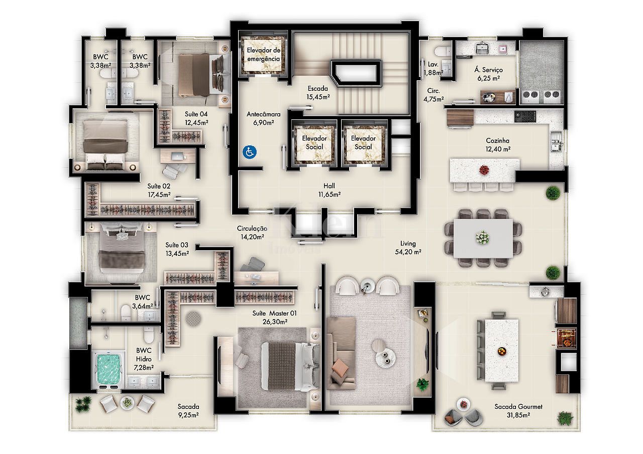 4 suítes | 259m² privativos | 3 vagas | 3 elevadores | Área total 380m²
