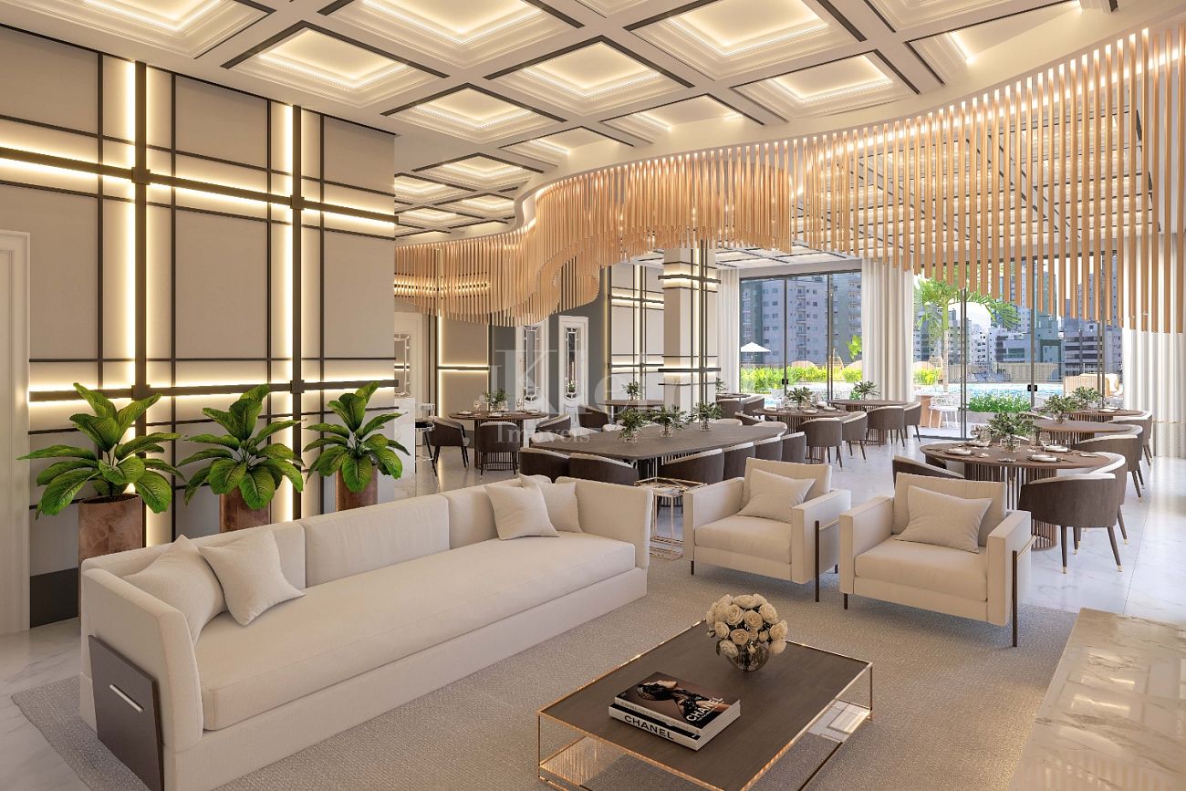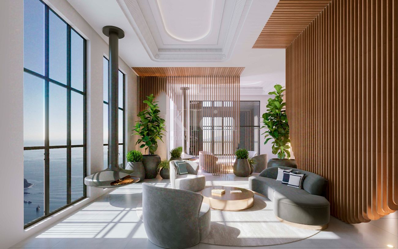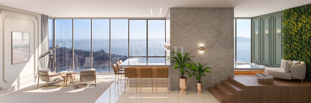 Com posição privilegiada em altura elevada, a penthouse oferece uma vista panorâmica do mar e da cidade, perceptível desde os ambientes sociais até as áreas íntimas. A integração entre living, sala de estar e jantar cria um espaço amplo, sofisticado e ideal para receber, enquanto a planta valoriza iluminação natural, ventilação e conforto em todos os ambientes.